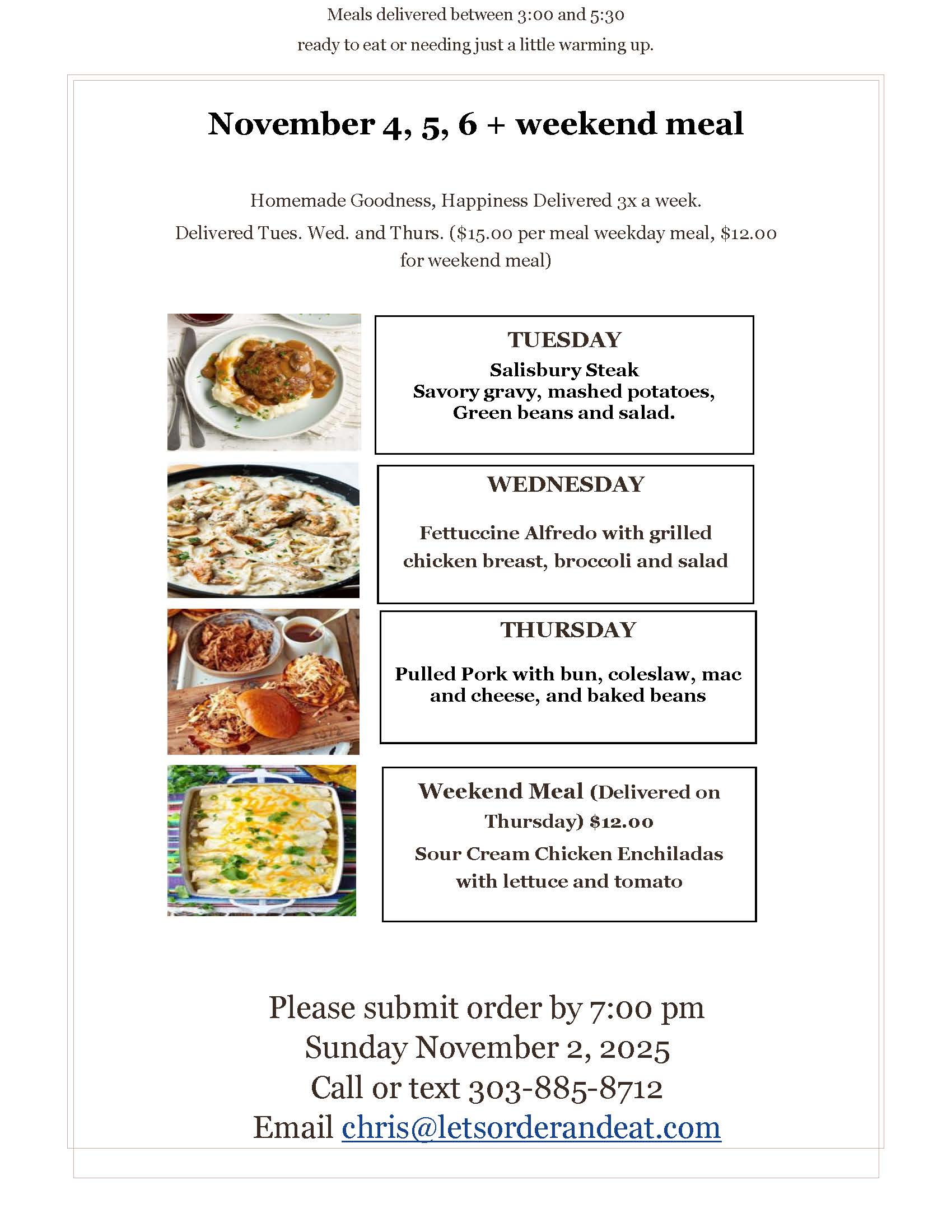 As always, please place your order by 7:00 PM Sunday, November 2, 2025