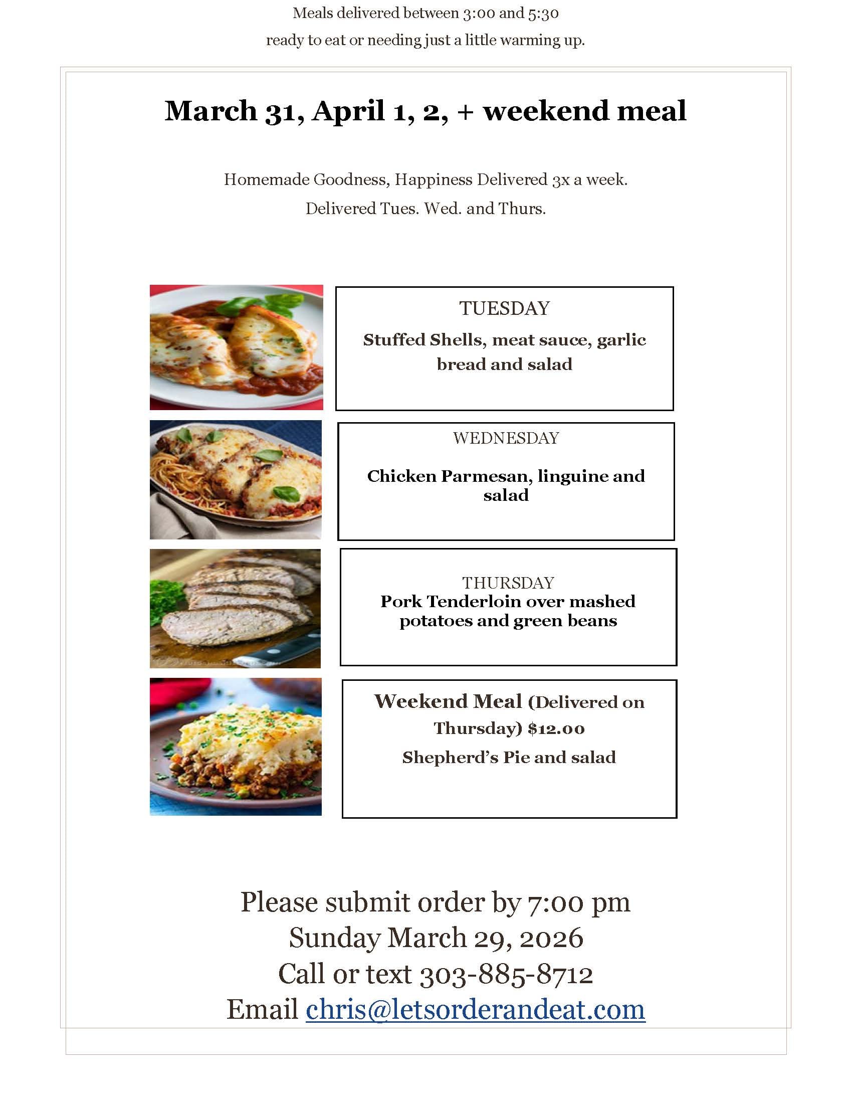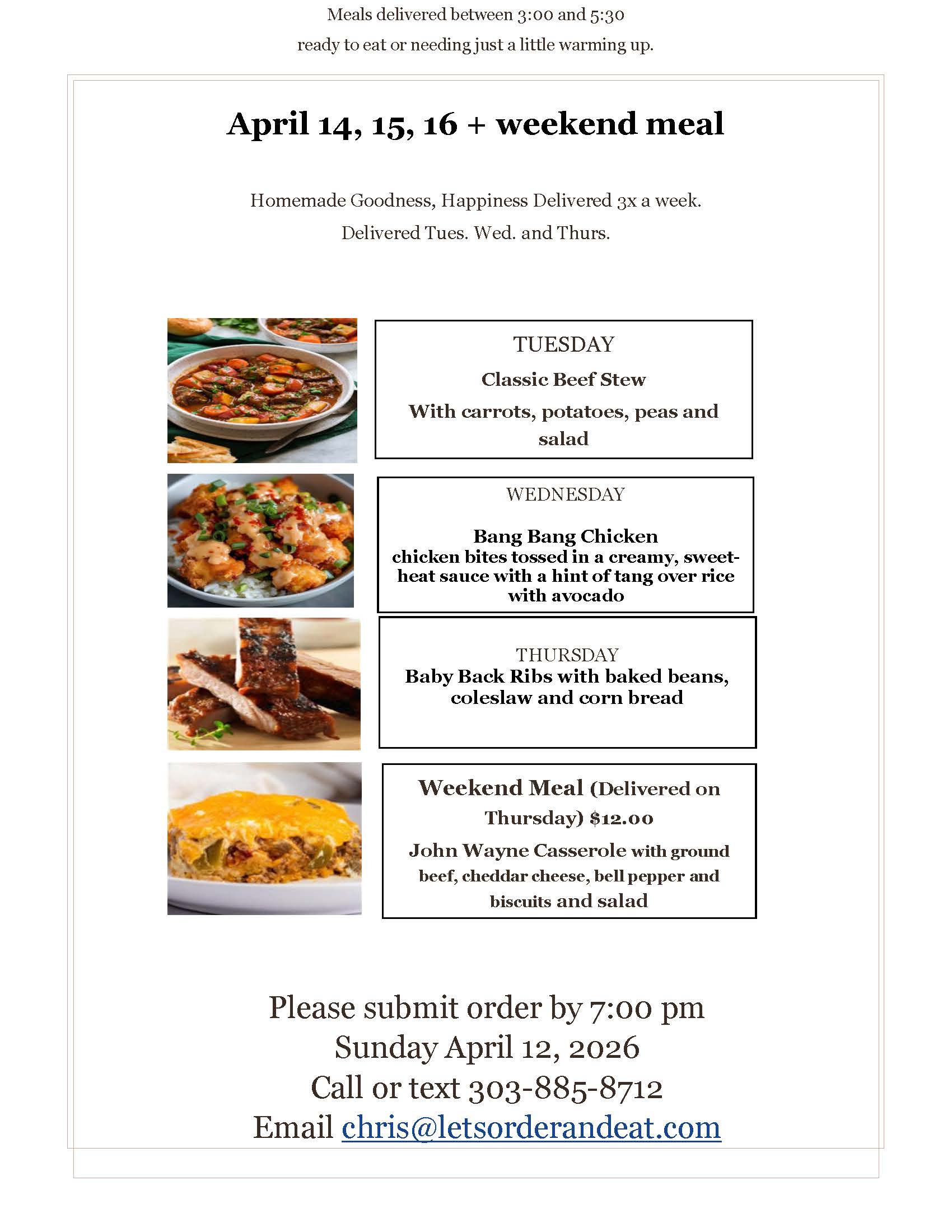 Here is this week's menu – just like always, you’re welcome to order any or all of the meals offered on Tuesday, Wednesday, and Thursday. The weekend meal will be delivered on Thursday.
