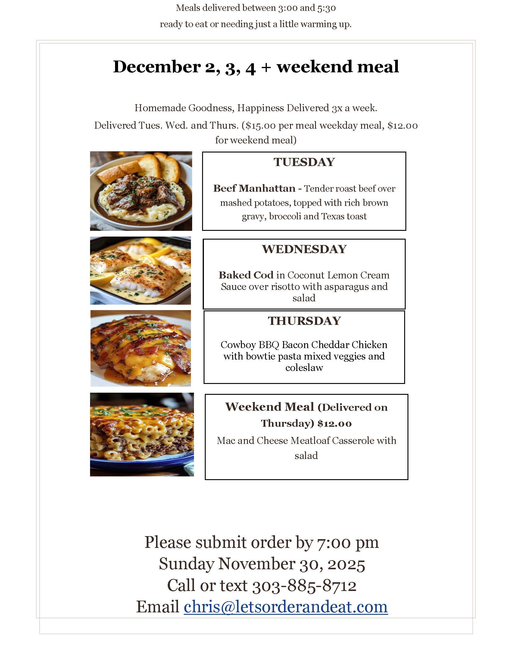 Hello! Here is this week's menu – just like always, you’re welcome to order any or all of the meals offered on Tuesday, Wednesday, and Thursday. The weekend meal will be delivered on Thursday too. This Week’s Soup & Salad Option Harvest Chicken Salad with Mixed Greens, Apple & Sweet Potato and Hearty Lentil Potato Soup This full-size meal is $15.00 – just like our regular entrees. This is a great choice for anyone looking for something fresh and light! As always, please place your order by 7:00 PM Sunday, November 30. Homemade Goodness, Warmly, SEE MENU BELOW |