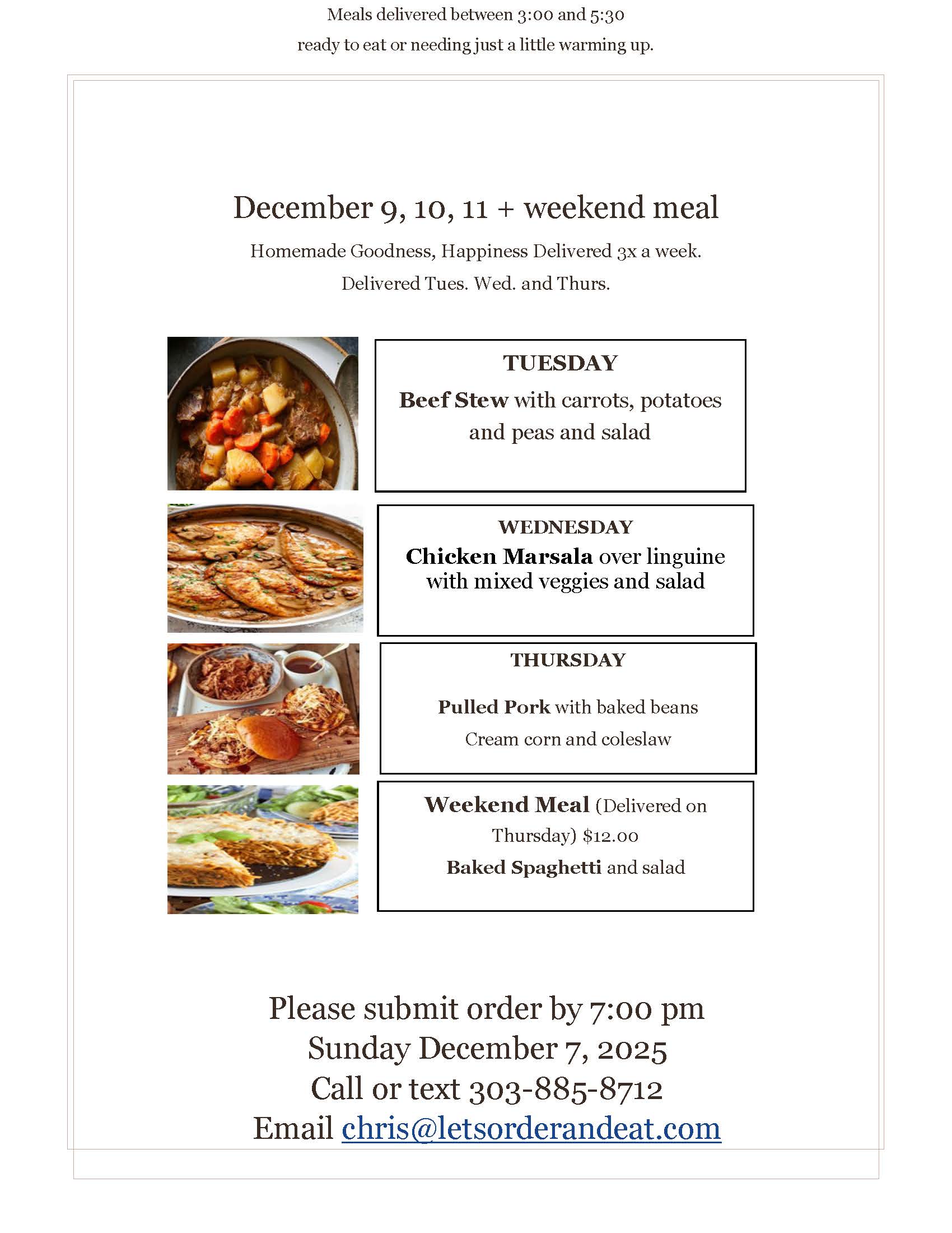 Hello! Here is this week's menu – just like always, you’re welcome to order any or all of the meals offered on Tuesday, Wednesday, and Thursday. The weekend meal will be delivered on Thursday too. This Week’s Soup & Salad Option Italian Chopped Salad (lettuce, tomato, mozzarella and provolone cheese, pepperoncini, salami, ham and garbanzo beans) Italian Wedding Soup (tiny meatballs, spinach and pasta) This full-size meal is $15.00 – just like our regular entrees. This is a great choice for anyone looking for something fresh and light! As always, please place your order by 7:00 PM Sunday, December 7. Homemade Goodness, Warmly, SEE MENU BELOW |