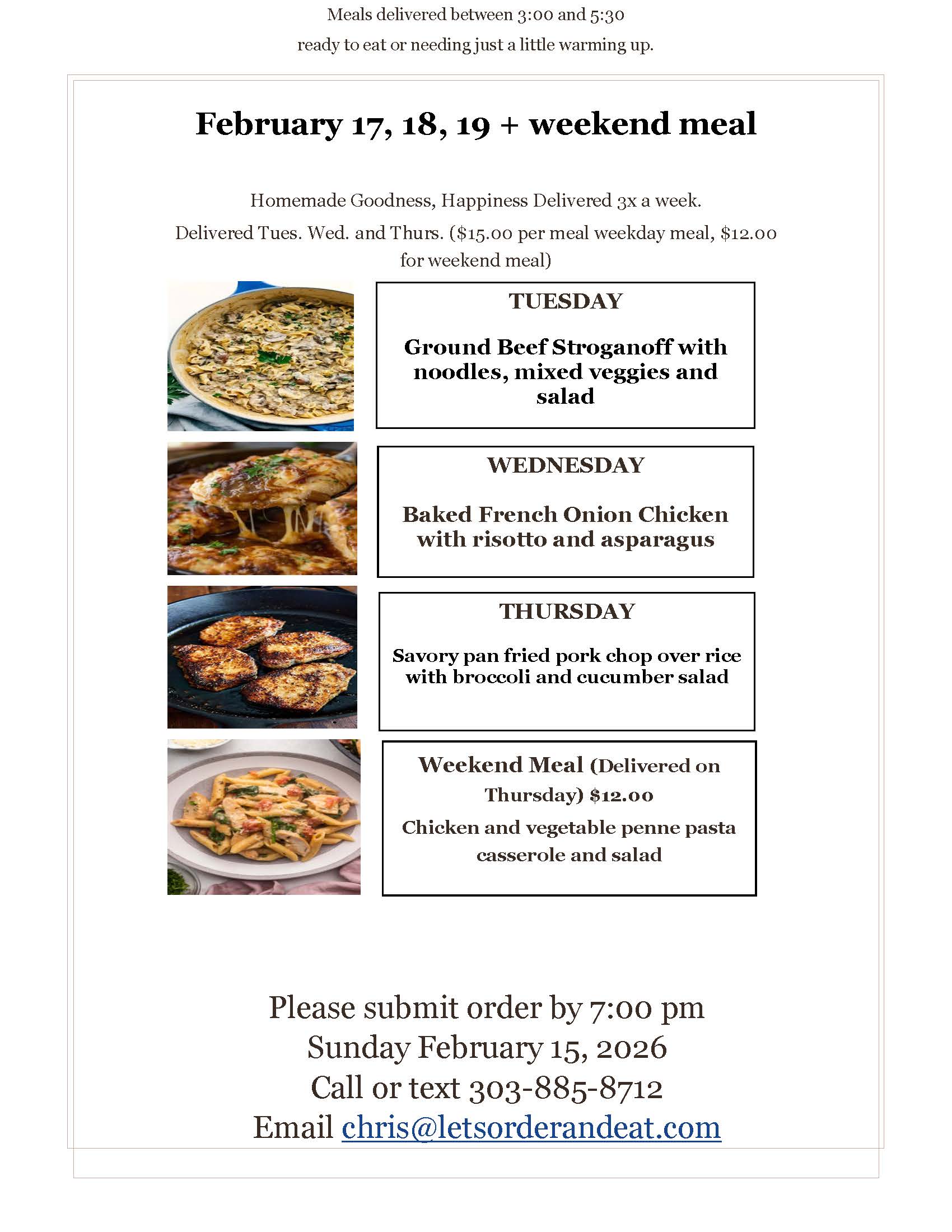 Here is this week's menu – just like always, you’re welcome to order any or all of the meals offered on Tuesday, Wednesday, and Thursday. The weekend meal will be delivered on Thursday.